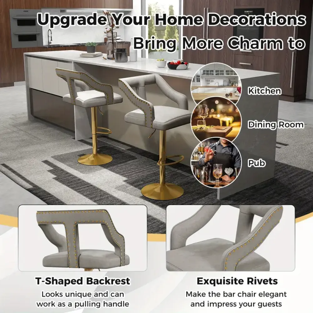 Enjoy Superior Comfort With Our Luxurious Bar Chair Set. Upholstered In Plush Dutch Velvet, Each Bar Stool Provides Great Comfort. The T-shaped Backrest And Wide Seat Add An Extra Touch Of Luxury. With More Customized Features And An SGS Gas Rod, Find Your Perfect Sitting Position With The Adjustable Seat Height, Ranging From 25" To 34". The Ergonomic Footrest Offers Additional Support And Relaxation. The Swivel Seat Makes It Convenient To Communicate With Friends And Reach For Items Without Having To Move The Entire Chair. Our Reliable Metal Base, With Its 2-layer Electroplated Coating, Ensures Scratch Resistance And Can Support A Weight Of Up To 330 Lbs, Making A Stable Sitting Experience A Reality. Say Goodbye To Unstable Chairs With Our Anti-slip Ring That Keeps The Bar Chair Stable While Protecting Your Floor. Suitable For Various Settings Such As The Dining Room, Pub, And Kitchen, This Bar Chair Set Is Easy To Assemble With The Provided Clear Instructions. .